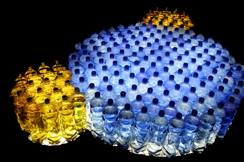 ![]() "Blaues Gold" (2007) Lichtobjekt mit 186 1,5l Pet-Wasserflaschen, Durchmesser 210 cm |