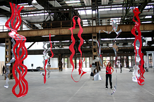 ![]() "Mobiles Spiel" (Lokhalle 2010) Installation mit 12 hängenden Objekten (Kunststoff und Spiegelfolie, Nylonfaden, 1000x1000x500 cm) |
